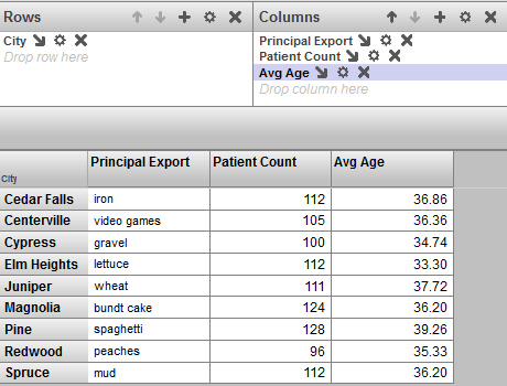 In contrast to using the pivot options, this approach allows each measure to be aggregated in a different manner. The Patient Count measure is summed, and the Avg Age and Avg Allergy Count measures are averaged.