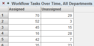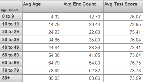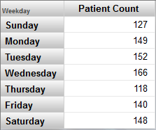 Notice that the y-axis is labeled Patient Count. The filled area that displays the Patient Count measure is scaled to match the values on this axis. In contrast, the line that displays Avg Enc Count does not correlate with the y-axis — this line is only scaled overall to fit within the chart.