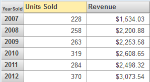 A time chart is useful for displaying values over time. For this kind of chart, the data source must have time members (such as years) for rows. The following shows an example: